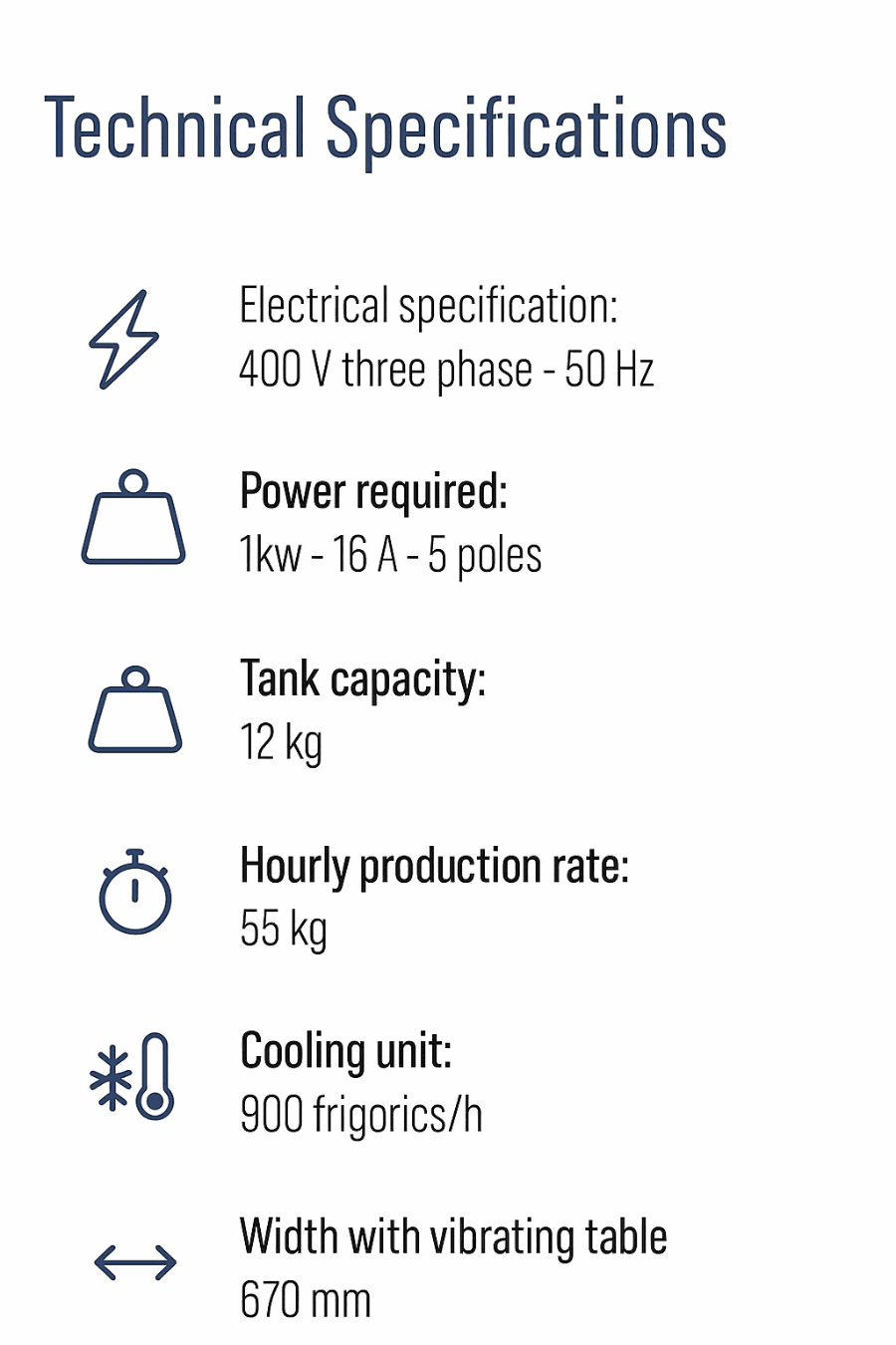 • Tempers 12 Kg of chocolate in 7 minutes.